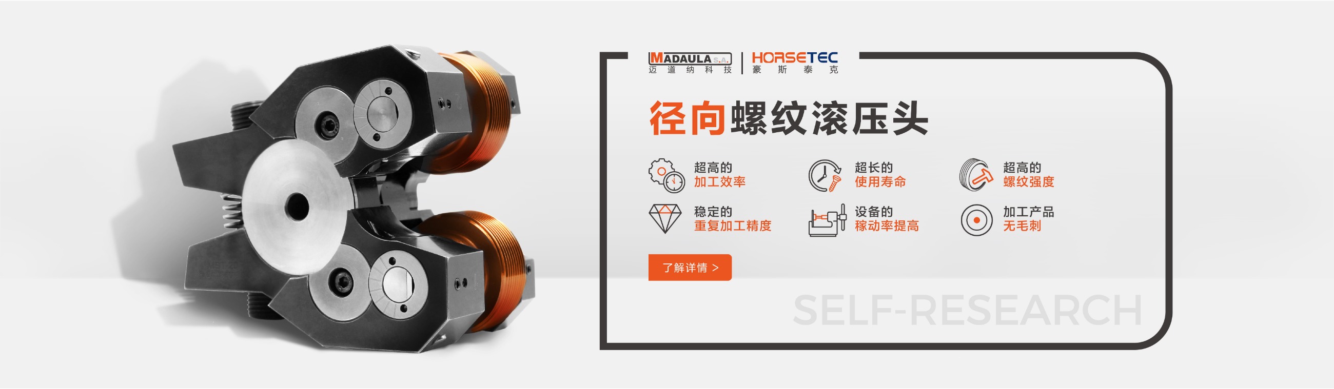 豪斯泰克HORSETEC · 花鍵花紋滾壓頭 有:軸向花紋滾壓頭、徑向花紋滾壓頭、滾花刀等。 -- 滾壓頭替代了單刃刀具加工螺紋效率低、成本高的問(wèn)題,在一次裝夾一個(gè)工序上加工完成,可以減少95%的螺紋加工時(shí)間,降低生產(chǎn)成本。 -- 延伸系數(shù)達(dá)到5%的材料都可以進(jìn)行滾壓加工。 -- 如果在有芯軸支撐的狀況下,薄壁空心零件也可以進(jìn)行滾壓加工。 -- 可用于大多數(shù)類型的機(jī)床:數(shù)控機(jī)床、鉆床、單軸車床、多軸機(jī)床、轉(zhuǎn)盤式機(jī)床、CNC車床、加工中心、走心機(jī)、專機(jī)及縱切機(jī)床等。