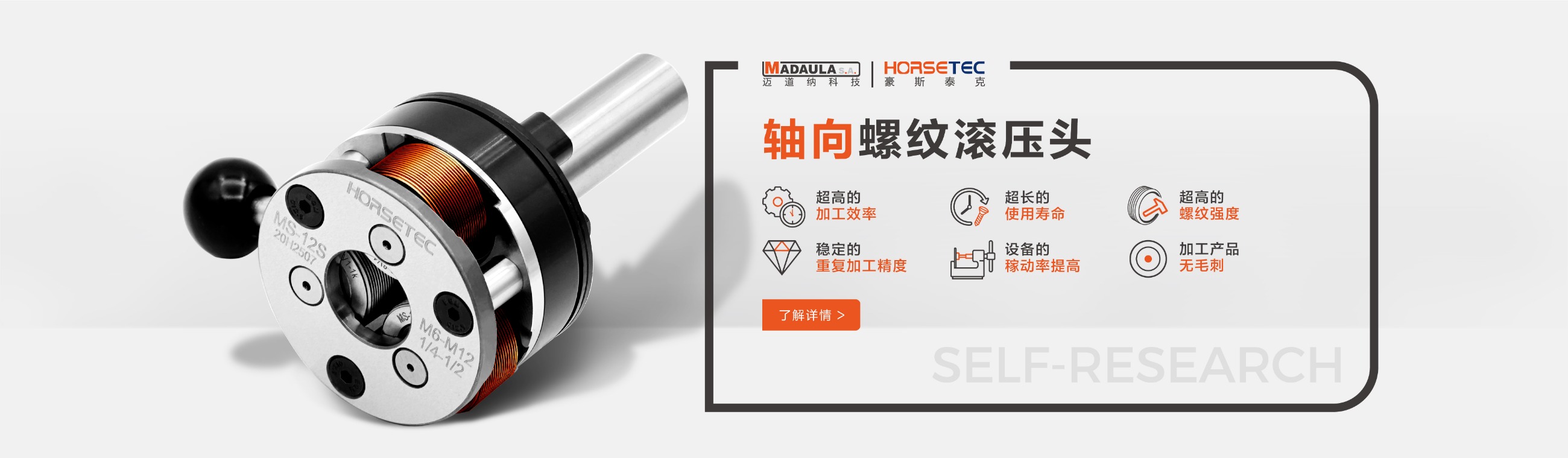 豪斯泰克HORSETEC · 花鍵花紋滾壓頭 有:軸向花紋滾壓頭、徑向花紋滾壓頭、滾花刀等。 -- 滾壓頭替代了單刃刀具加工螺紋效率低、成本高的問(wèn)題,在一次裝夾一個(gè)工序上加工完成,可以減少95%的螺紋加工時(shí)間,降低生產(chǎn)成本。 -- 延伸系數(shù)達(dá)到5%的材料都可以進(jìn)行滾壓加工。 -- 如果在有芯軸支撐的狀況下,薄壁空心零件也可以進(jìn)行滾壓加工。 -- 可用于大多數(shù)類型的機(jī)床:數(shù)控機(jī)床、鉆床、單軸車床、多軸機(jī)床、轉(zhuǎn)盤式機(jī)床、CNC車床、加工中心、走心機(jī)、專機(jī)及縱切機(jī)床等。